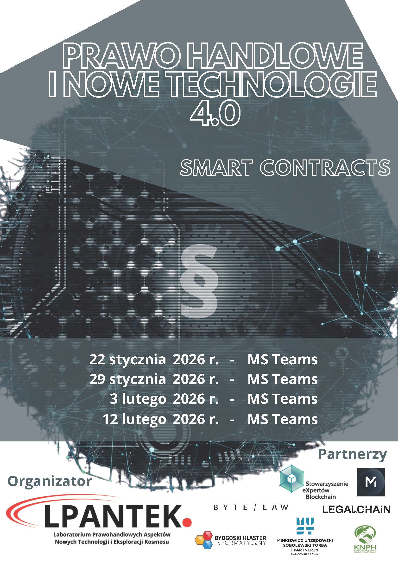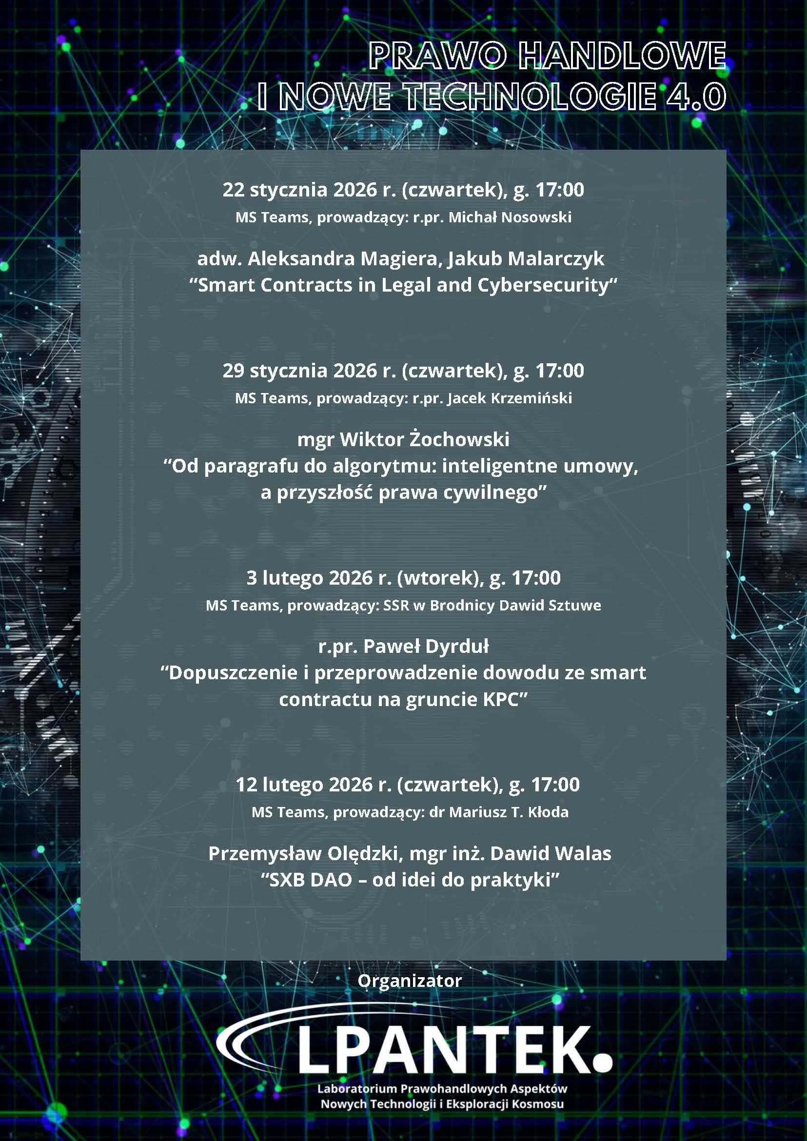 Motywem przewodnim tegorocznej serii prelekcji są smart contracts (inteligentne umowy/kontrakty). Smart contracts stanowią dobry przykład zjawiska przenikania się nowych technologii oraz prawa. W ujęciu rozwijanym od momentu przedstawienia swych idei przez Vitalika Buterina (bazujących na wcześniejszych pracach Nicka Szabo), inteligentne umowy wydają się przyjmować postać programów komputerowych przechowywanych w systemach technologii rozproszonych rejestrów (DLT). Kwestii od omówienia we wskazanym zakresie jest wiele, a do części z nich odniosą się Szanowni Prelegenci.