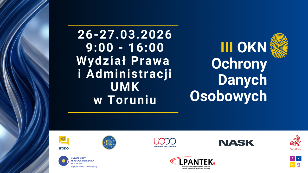 Zapraszamy do udziału w III OKN Ochrony Danych Osobowych, która odbędzie się w dniach 26-27 marca br. w gmachu Wydziału Prawa i Administracji UMK w Toruniu oraz online. Jej Organizatorem jest Interdyscyplinarne Forum Ochrony Danych Osobowych, a LPANTEK objął ją Patronatem.